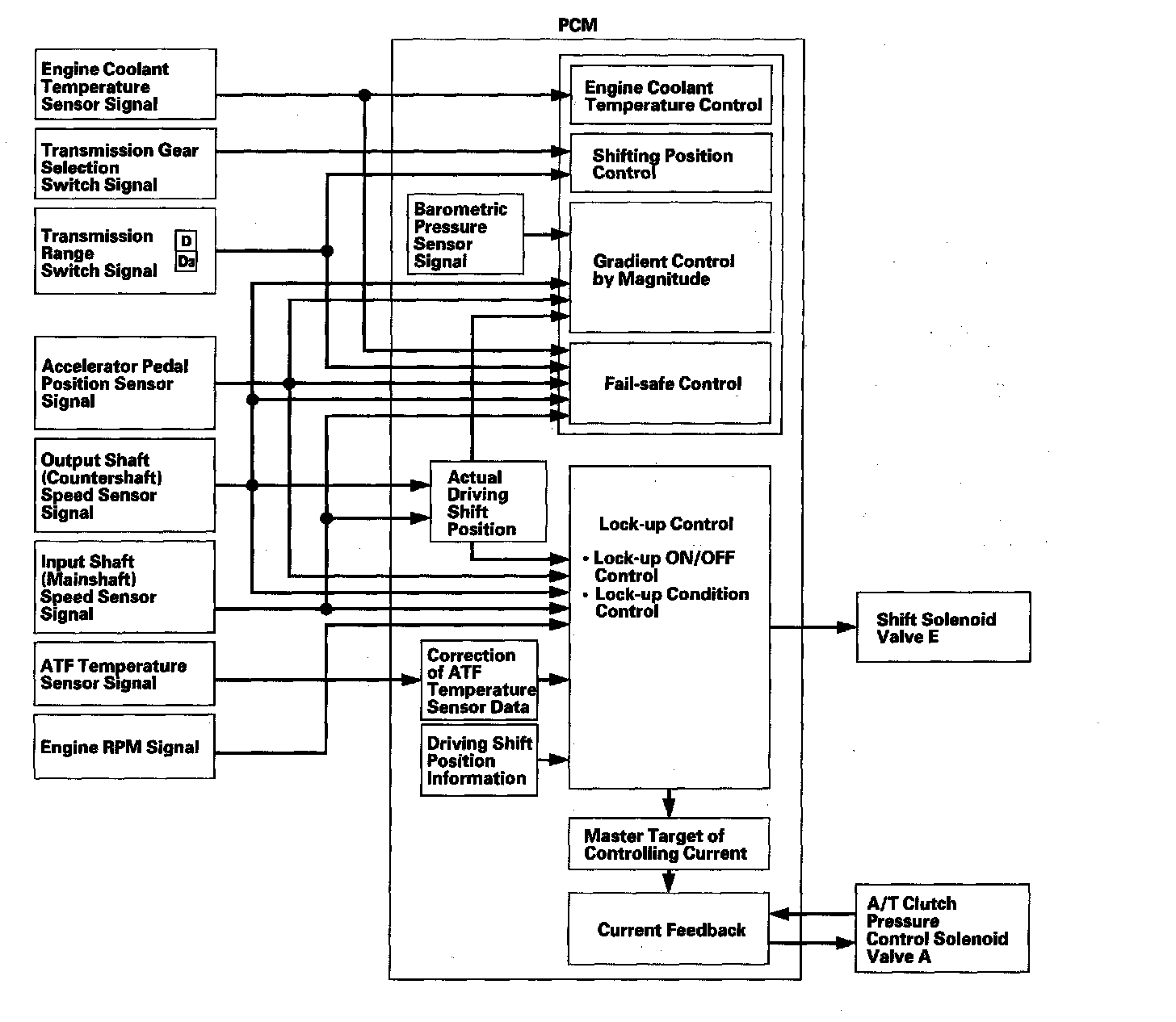 The PCM receives input signals from the sensors, the switches, and other control units, processes data, and outputs signals for the engine control system and the A/T control system. The A/T control system includes shift control, grade logic control, clutch pressure control, and lock-up control.