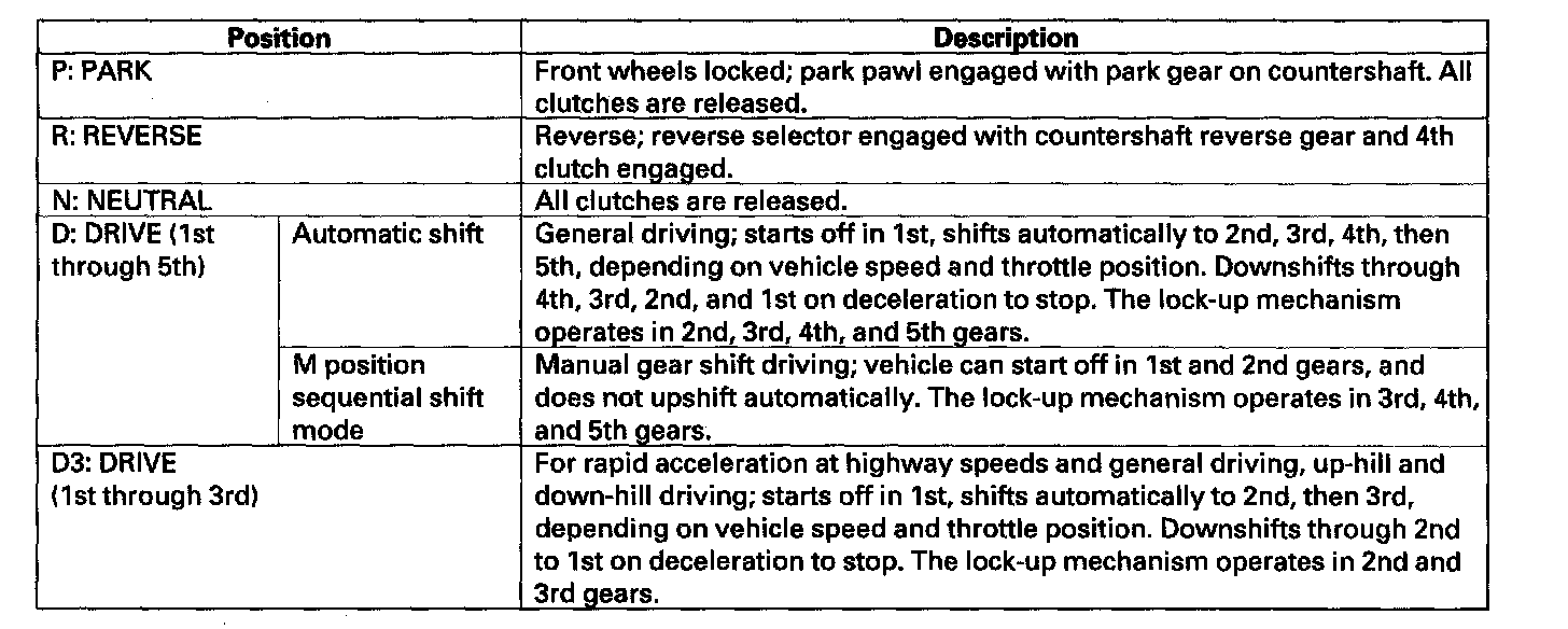 The shift lever has five positions: P: PARK, R: REVERSE, N: NEUTRAL, D: DRIVE 1st through 5th gear range with automatic shift and sequential shift in M (sequential shift mode), and D3: DRIVE 1st through 3rd gear range with automatic shift.