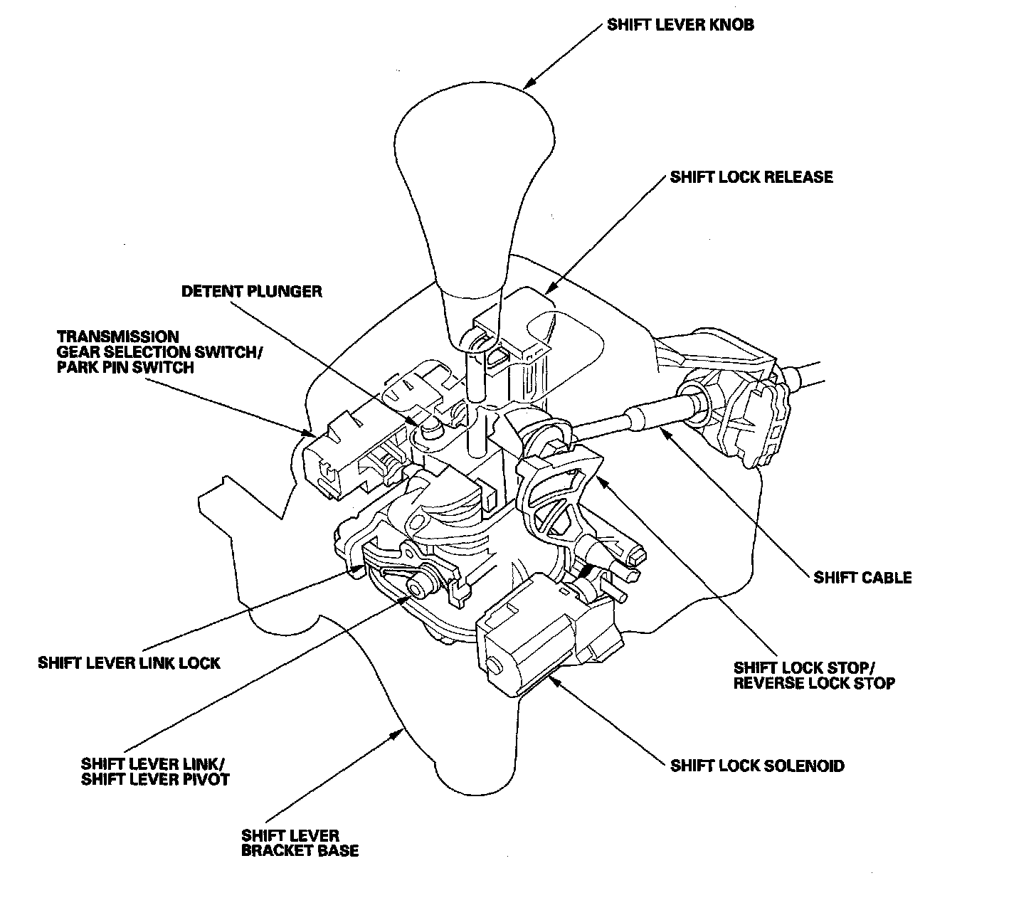 Shift Lever MechanismThe shift lever has five positions; P, R, N, D, and D3. D has two modes; automatic shift mode and sequential shift mode with the shift lever moved to M. The shift lever movement and position is indicated by the A/T gear position indicator panel. The shift lever can be shifted out of P and into R without pressing the shift lever. The shift lock/reverse lock mechanism is an additional shift lever lockout mechanism. The shift lever is engaged with the shift lever link in P, R, N, D, and D3. This unit shifts the transmission using the shift cable connected between the shift cable link and the transmission selector control shaft.