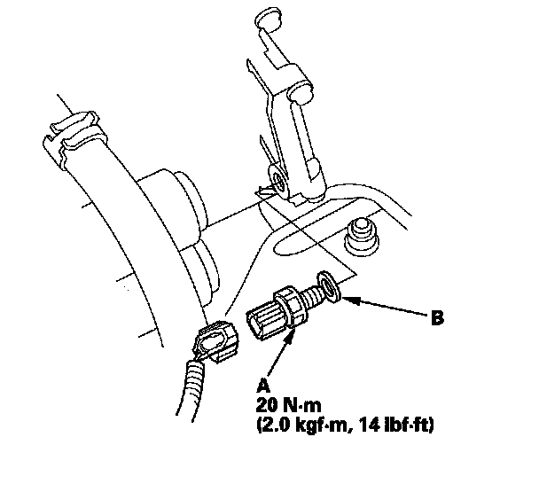 7. Install a new 3rd clutch transmission fluid pressure switch (A) with a new sealing washer (B), and tighten the switch to the specified torque by turning the metal part, not the plastic part.