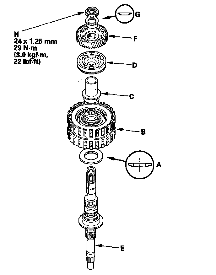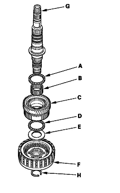 1. Install the thrust needle bearing (A), the needle bearing (B), 1st gear (C), the thrust needle bearing (D), the 40 x 51.5 mm thrust washer (E), the 1st/3rd clutch (F), and the 3rd gear collar (G) on the secondary shaft (H). Do not install the O-rings during inspection.