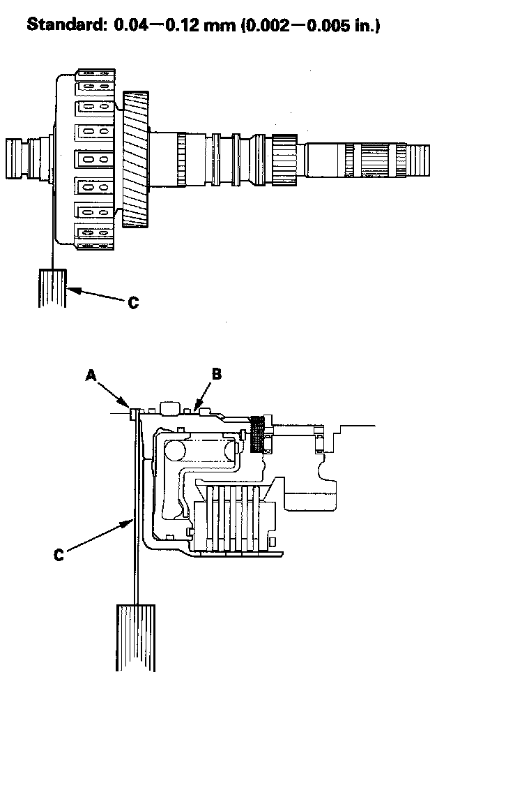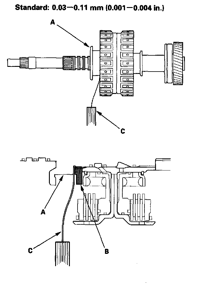 5. Measure the clearance between the mainshaft flange (A) and the 41 x 68 mm thrust washer (B) with a feeler gauge (C), in at least three places. Use the average as the actual clearance.