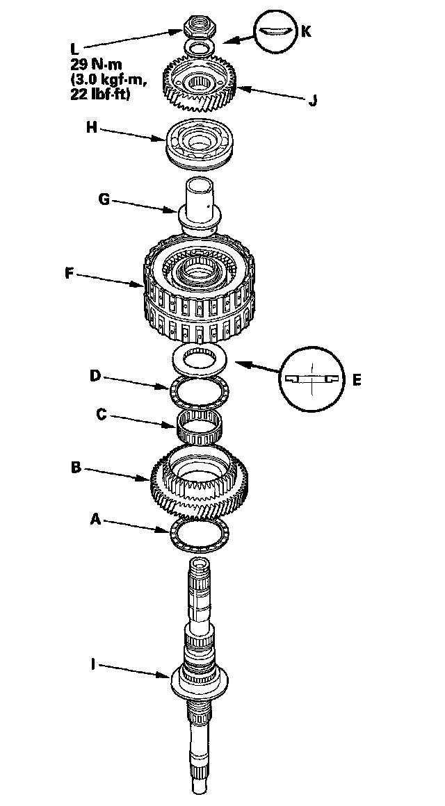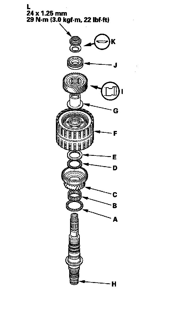 3. Install the idler gear (J) on the mainshaft with a press, then install the conical spring washer (K) and the locknut (L).