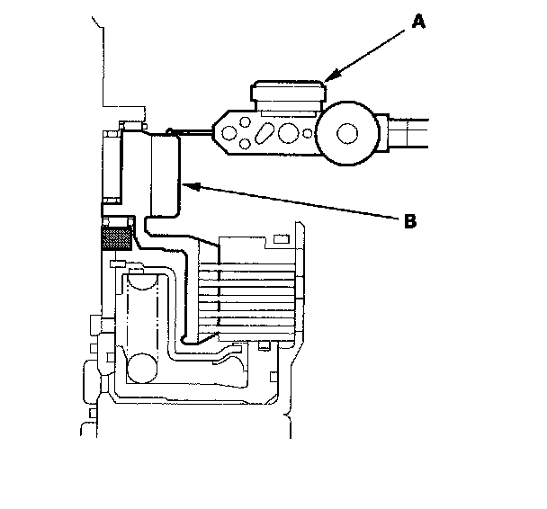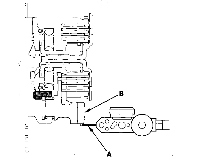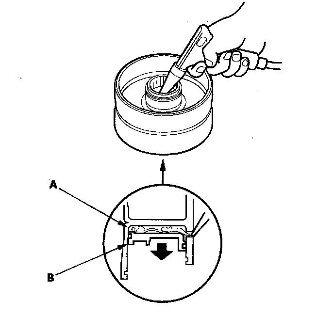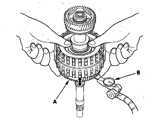 21. Wrap a shop rag around the clutch drum (A), and apply air pressure to the fluid passage to remove the piston (B). Place a finger tip on the other passage while applying air pressure.