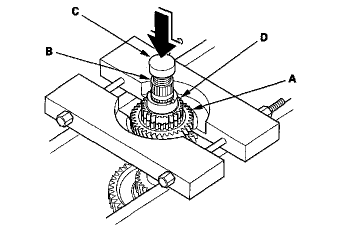 1. Install the bearing separator on 4th gear (A). Set a press on the countershaft (B) with a spacer (C) between the press and the countershaft. Support the bottom of the countershaft with one hand, then press the countershaft out of the press-fitted reverse selector hub. The countershaft will drop down after pressing it out of the press-fitted reverse selector hub.