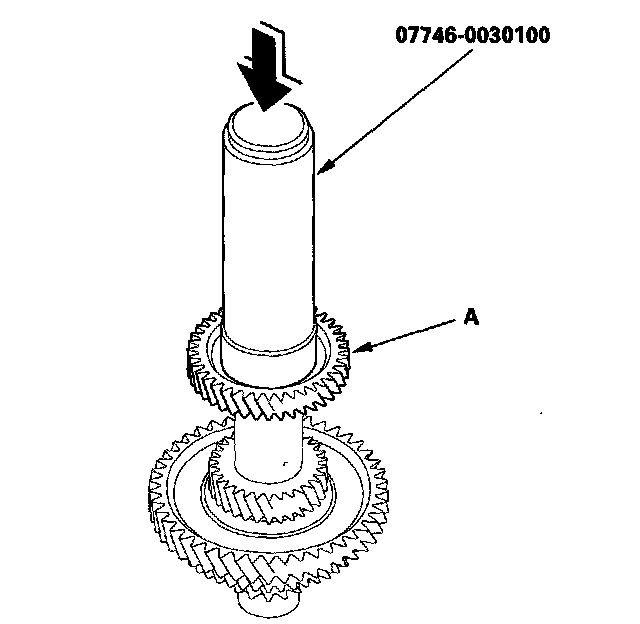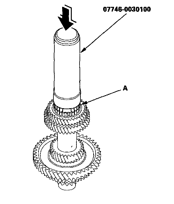 3. Slide 3rd gear (A) over the countershaft, and press it in place using the 40 mm driver and a press.