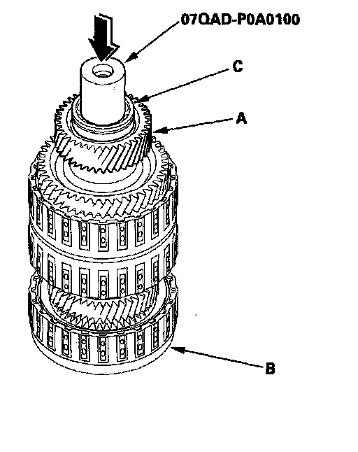 Install the idler gear (A) on the secondary shaft (B), and install the ball bearing (C) over the idler gear using the 42 mm attachment and a press.