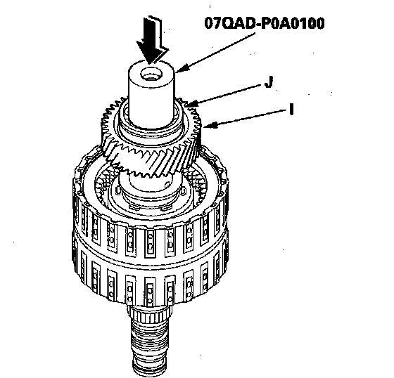 2. Install the idler gear (I), then install the ball bearing (J) on the idler gear using the 42 mm attachment and a press.