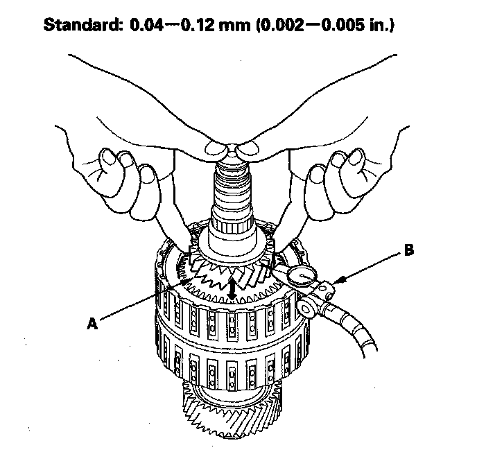 6. Lift 5th gear (A) up while holding the mainshaft, and use the dial indicator (B) to read the 5th gear axial clearance.