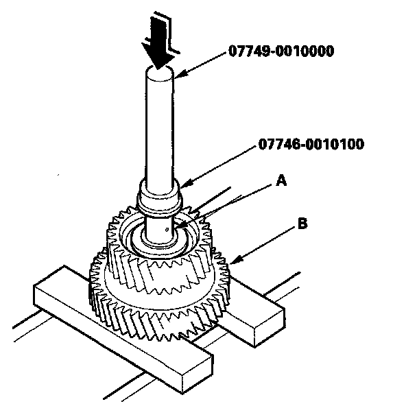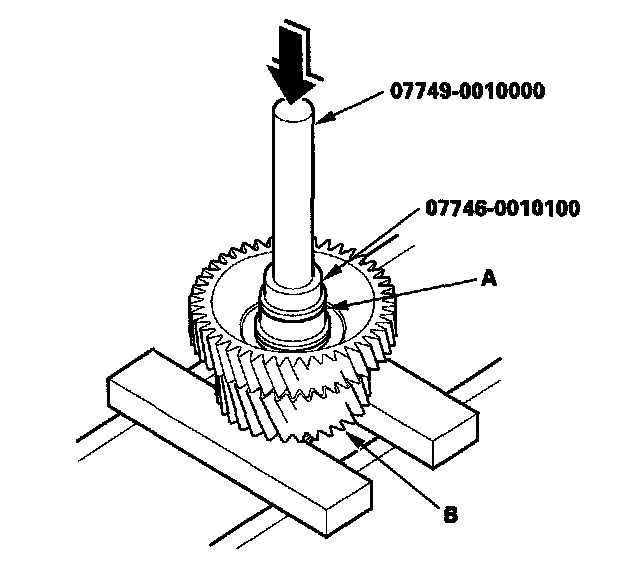 3. Set the press on the countershaft (A) with a spacer (B) between the press and countershaft. Support the bottom of the countershaft with one hand, then press the countershaft out of 3rd gear. The countershaft will drop down after pressing it out of 3rd gear.