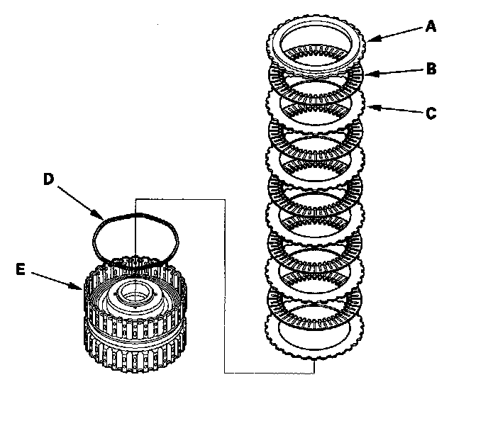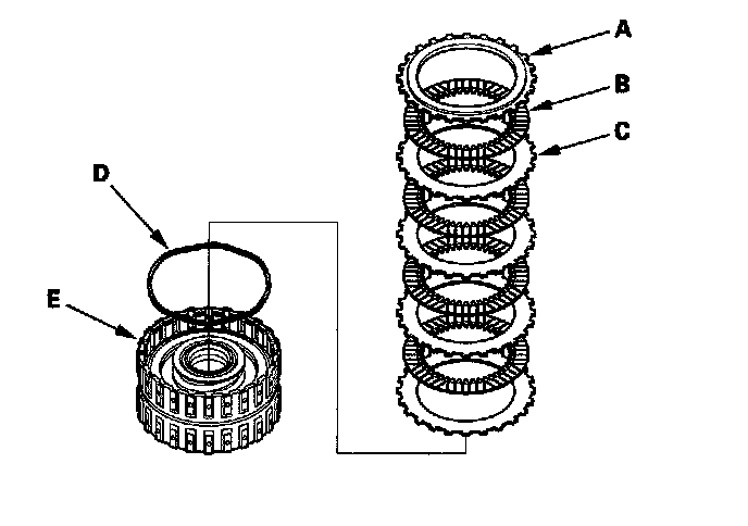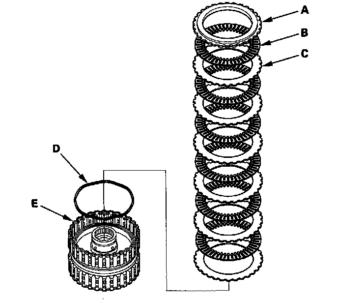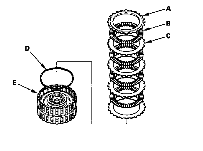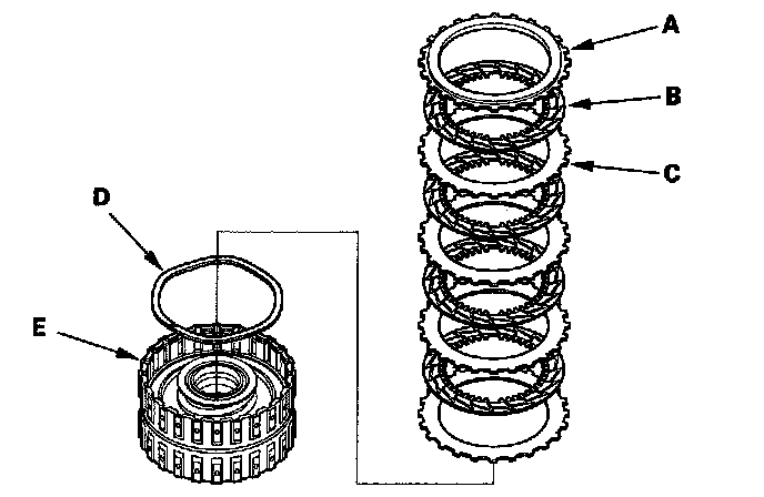11. '04-05 models 5th clutch: Remove the clutch end-plate (A), the clutch discs (B) (4), the clutch wave-plates (C) (4), and the waved spring (D) from the 5th clutch drum (E).