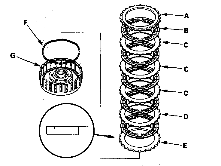 3. '04-05 models 2nd clutch: Remove the clutch end-plate (A), the clutch discs (B) (5), the clutch wave-plates (C) (3), the 2.0 mm-thick flat-plate (D), the 4.0 mm-thick plate (E), and the waved spring (F) from the 2nd clutch drum (G).