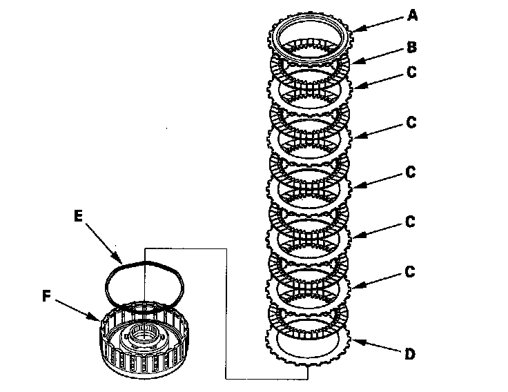 5. '06-08 models 2nd clutch: Remove the clutch end-plate (A), the clutch discs (B) (6), the clutch wave-plates (C) (5), the clutch flat-plate (D) (1), and the waved spring (E) from the 2nd clutch drum (F).