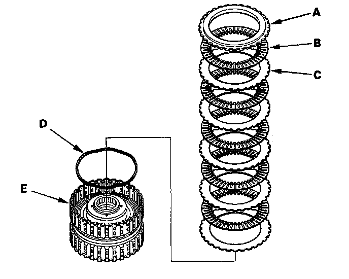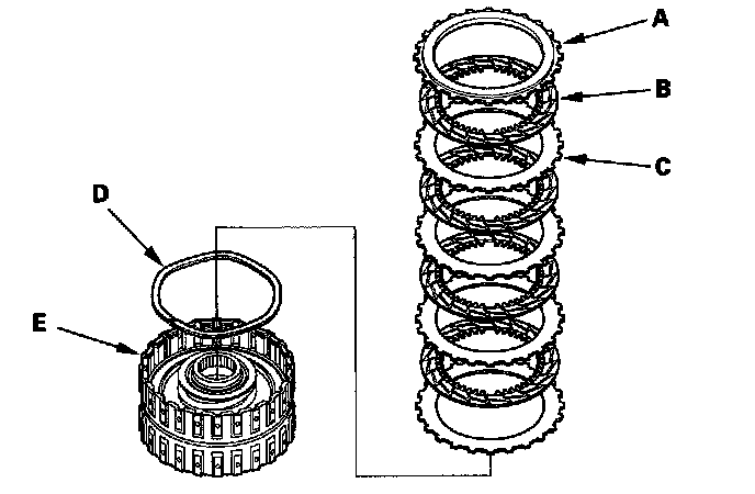 7. '04-05 models 3rd clutch: Remove the clutch end-plate (A), the clutch discs (B) (5), the clutch flat-plates (C) (5), and the waved spring (D) from the 3rd clutch drum (E).