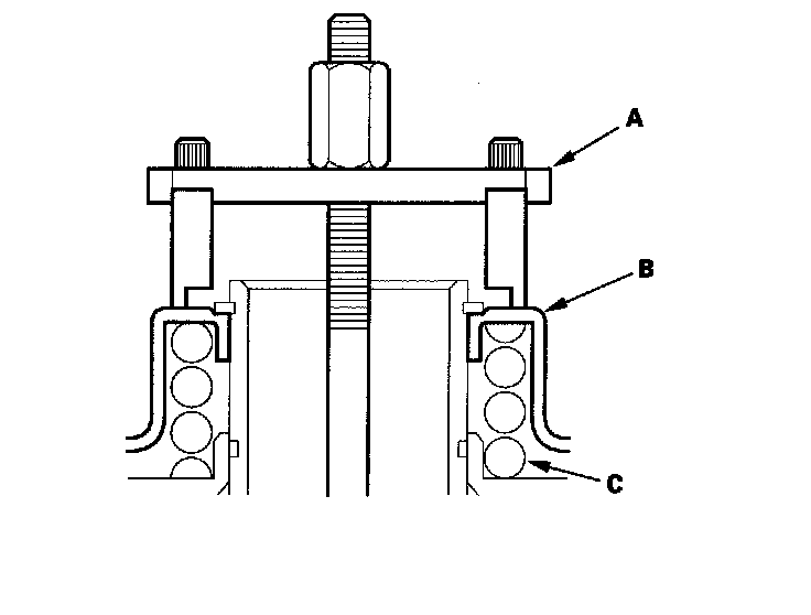 14. Set the clutch spring compressor attachment (A) on the spring retainer (B) of the 1st, 2nd, and 3rd clutches so the clutch spring compressor works on the clutch return spring (C).
