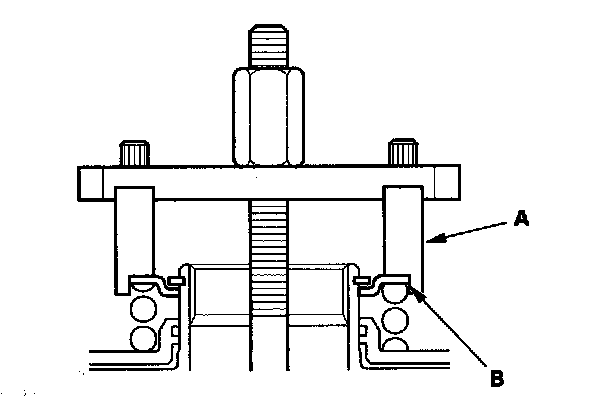 2. Remove the idler gear shaft (A) from the idler gear (B) using the driver and the 32 x 35 mm attachment and a press.
