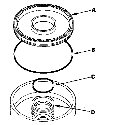 22. 1st, 2nd, and 3rd clutches: Remove the clutch piston (A), remove the O-ring (B) from the piston, and remove the O-ring (C) from the clutch drum (D).