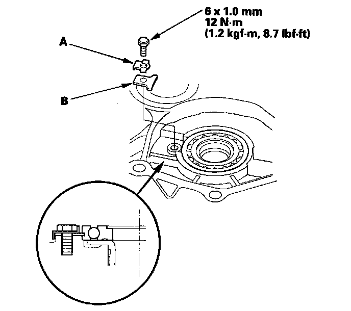 1. Remove the bolt, then remove the lock washer (A) and the bearing set plate (B).
