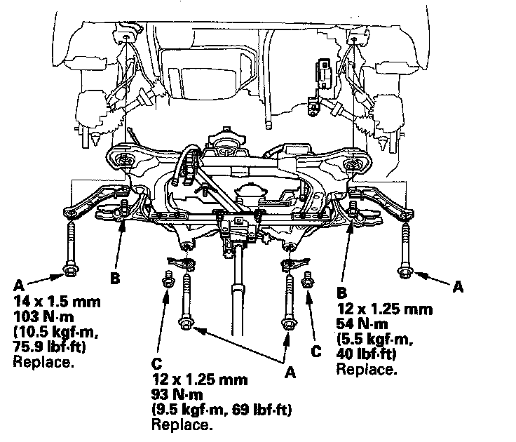 18. Loosely install new front subframe mounting bolts (A), and new stiffener mounting bolts (B) (C).
