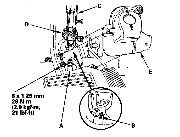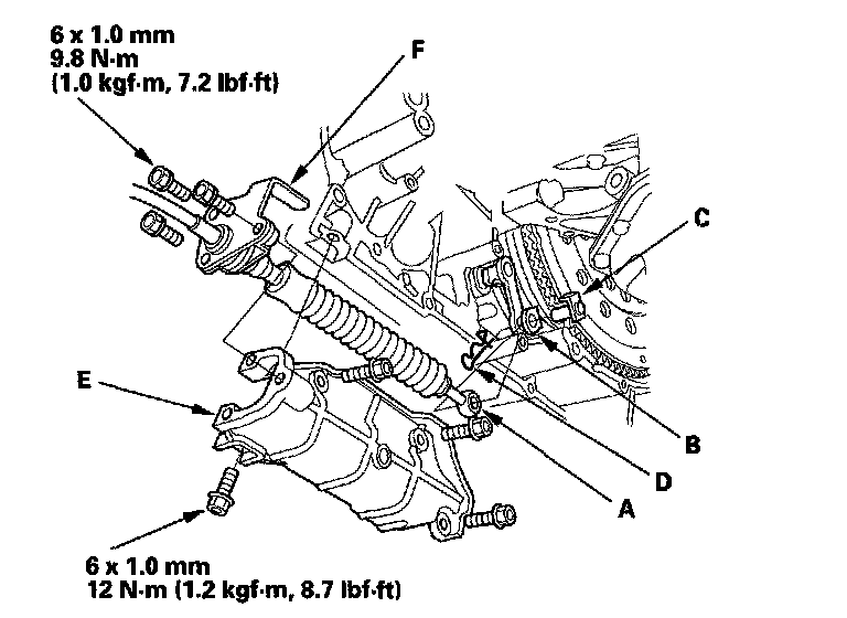 24. Install the shift cable cover (E), then secure the shift cable holder (F) to the shift cable cover with the three bolts.