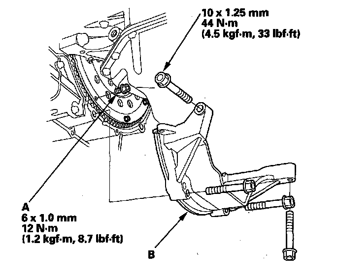 34. Install the front engine mount stop (B) and the vacuum hose clamp bracket (C).