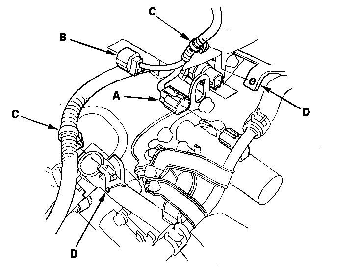 51. Install the A/T clutch pressure control solenoid valve A connector (A) and the 2nd clutch transmission fluid pressure switch connector (B), and install the harness clamps (C) on the harness clamp brackets (D).