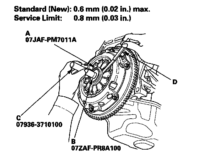 1. Check the height of the diaphragm spring fingers using the clutch alignment disc (A), clutch alignment shaft (B), 17 mm bearing remover shaft set (C), and a feeler gauge (D). If the height is more than the service limit, replace the pressure plate.