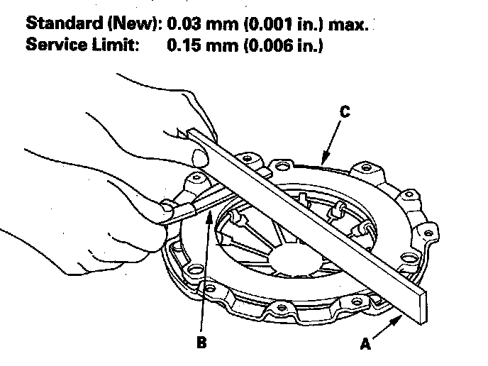 6. Inspect for warpage using a straight edge (A) and a feeler gauge (B). Measure across the pressure plate (C). If the warpage is more than the service limit, replace the pressure plate.