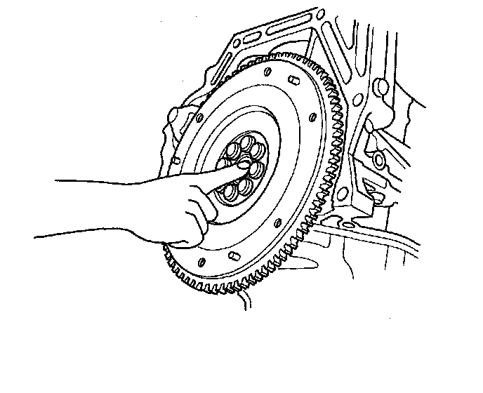 2. Remove the flywheel mounting bolts in a crisscross pattern in several steps, then remove the flywheel and ring gear holder.