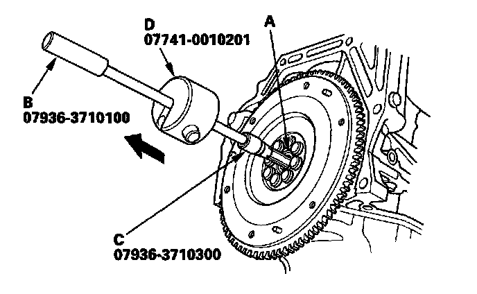 1. Remove the crankshaft pilot bushing (A) using the bearing remover shaft handle (B), 17 mm bearing remover shaft set, (C), and the sliding hammer weight (D).