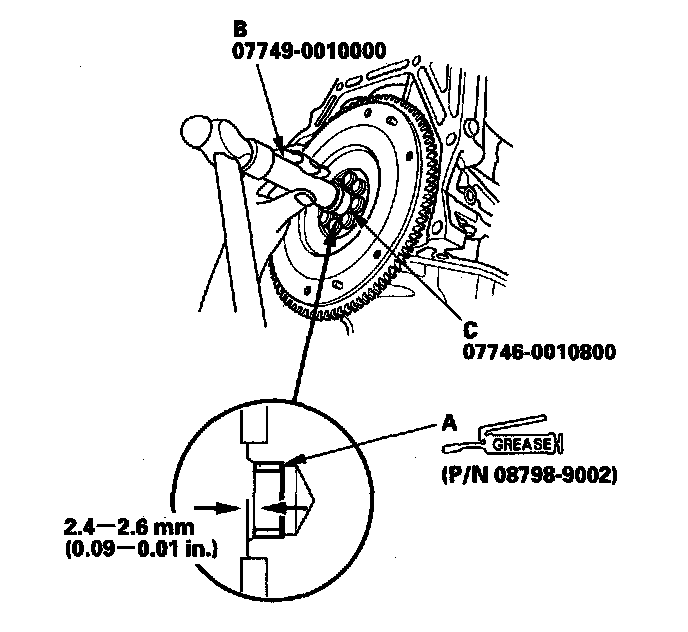 2. Install the new crankshaft pilot bushing (A) into the crankshaft using the driver (B) and 22 x 24 mm attachment (C). Apply a light coat of super high temp urea grease (P/N 08798-9002) to the crankshaft pilot bushing surface.