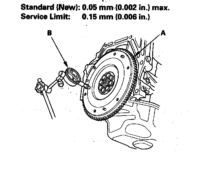 3. Measure the flywheel (A) runout using a dial indicator (B) through at least two full turns with the engine installed. Push against the flywheel each time you turn it to take up the crankshaft thrust washer clearance. If the runout is more than the service limit, replace the flywheel, and recheck the runout.