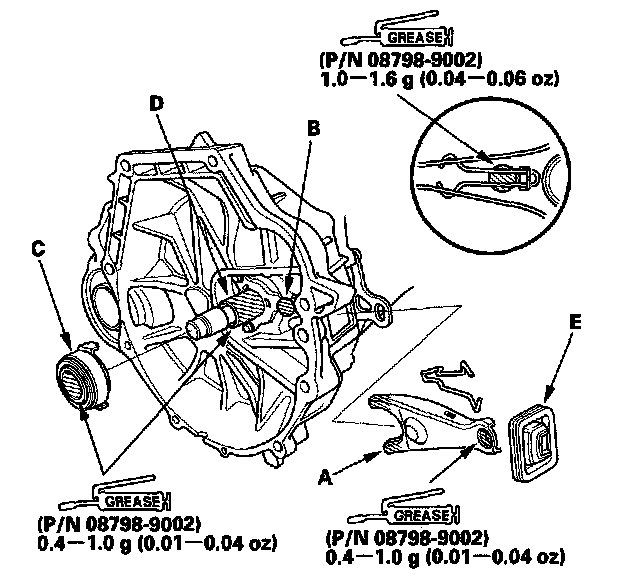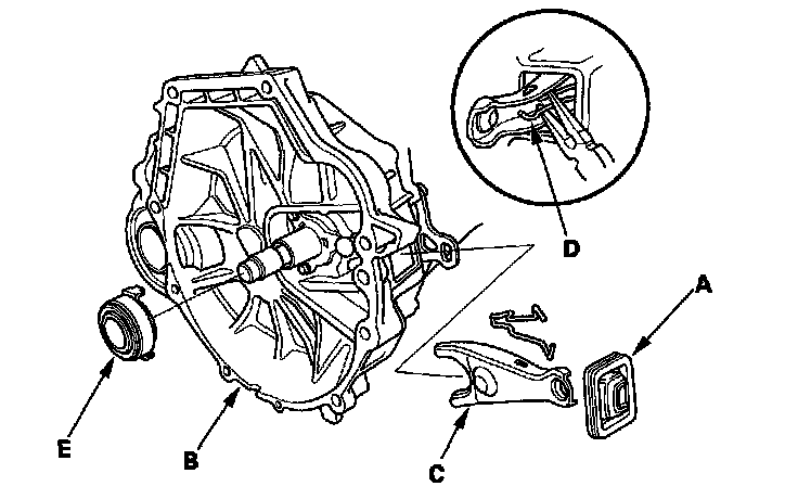 2. Remove the release fork (C) from the clutch housing by squeezing the release fork set spring (D) with pliers. Remove the release bearing (E).