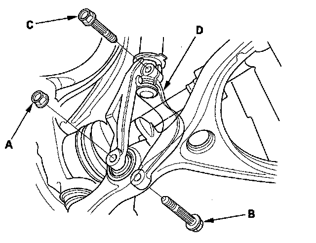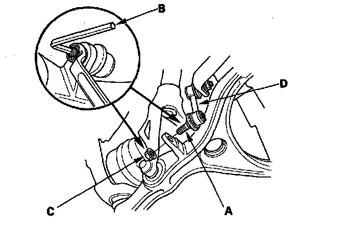 5. Hold the stabilizer ball joint pin (A) with a hex wrench (B), and remove the flange nut (C). Separate the front stabilizer link (D) from the lower arm.