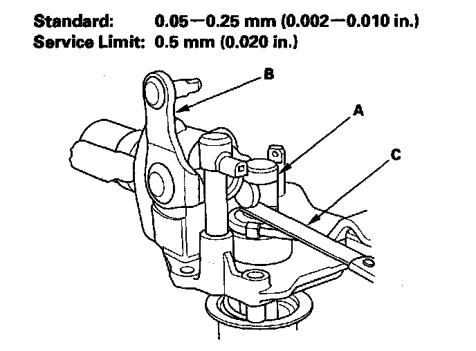 Change Lever Clearance Inspection1. Measure the clearance between the change lever (A) and the select lever (B) with a feeler gauge (C). If the clearance is more than the service limit, go to step 2.