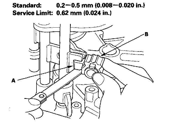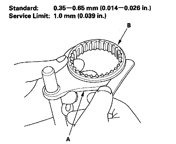 1. Measure the clearance between each shift fork (A) and its matching synchro sleeve (B). If the clearance exceeds the service limit, go to step 2.