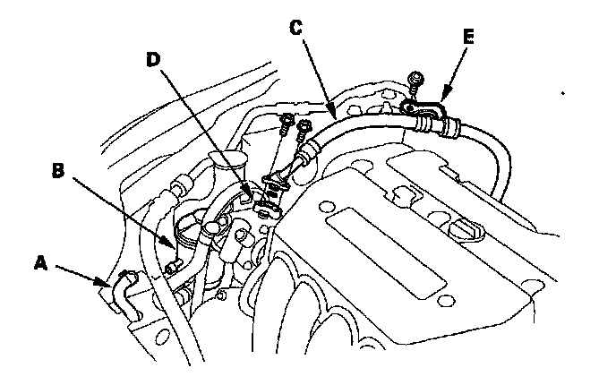 16. Remove the power steering pump outlet line bracket (E).