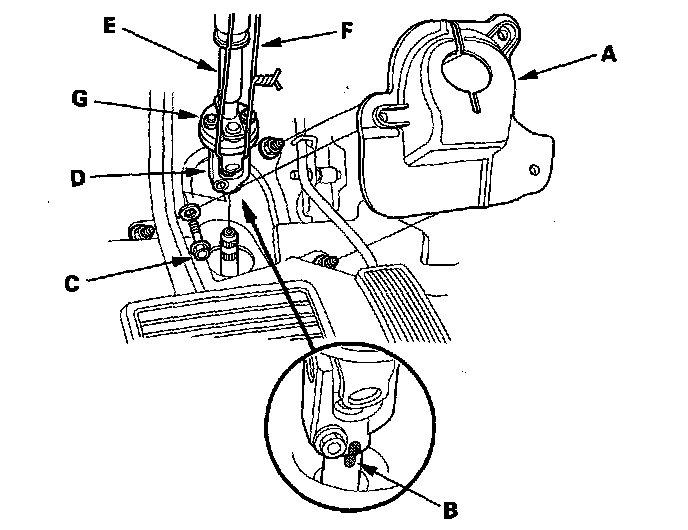 22. Make a reference mark (B) across the steering joint and steering gearbox pinion shaft. Remove the steering joint bolt (C), and disconnect the steering joint (D) by removing the steering joint toward the steering column. Hold the slider shaft (E) on the column with a piece of wire (F) between the joint yoke (G) on the slider shaft to the joint yoke on the upper shaft.