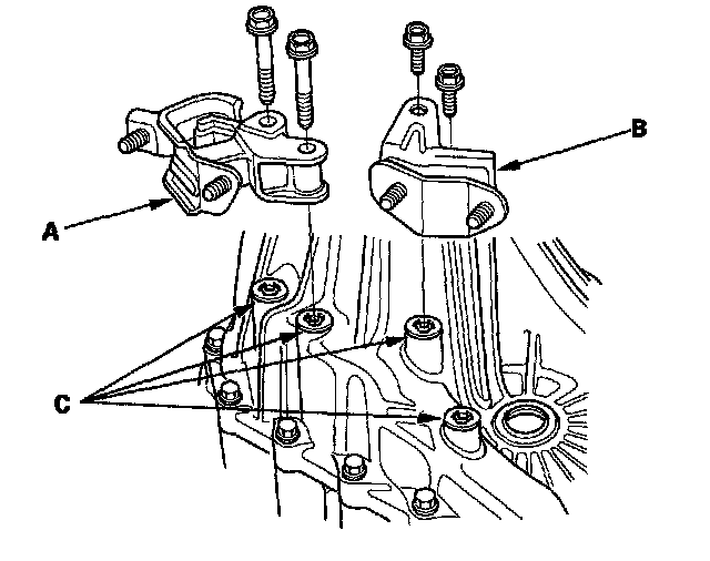 43. Remove the shift cable bracket (A), rear engine mount upper mounting bolt (B), and rear engine mount (C).