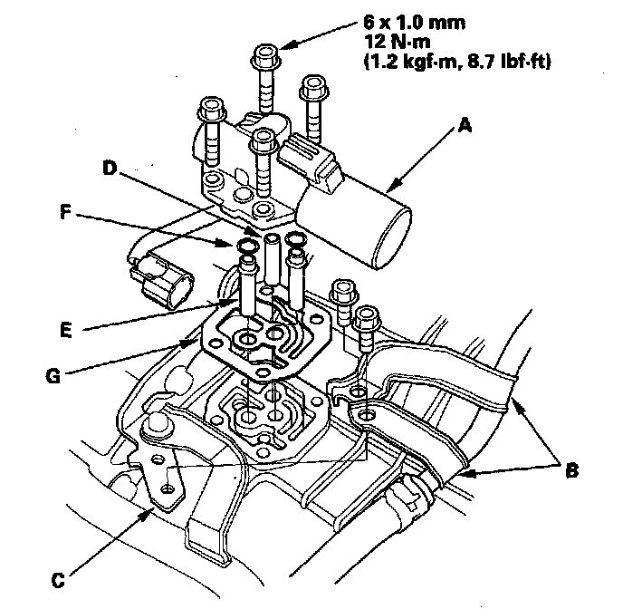 14. Remove the ATF pipe (D), the ATF joint pipes (E), the O-rings (F), and the gasket (G).