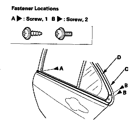2. Remove the screw (A) from the front edge of the door, and screws (B) fastening the rear portion of the door weatherstrip (C), sash, and the door outer molding (D).