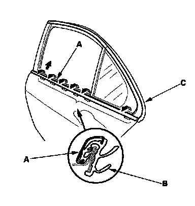 3. Starting at the front, pull the door glass outer weatherstrip (A) up at each portion where the inner molding (B) catches the inside edge of the window slot. Take care not to bend the door outer molding (C).
