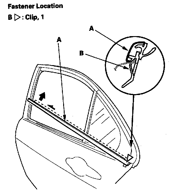 4. First slide the door glass outer weatherstrip (A) forward slightly, detach the rear clip (B) by pulling the front of the weatherstrip up, then remove the weatherstrip.