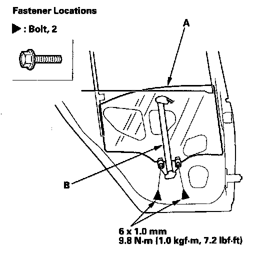 2. Carefully move the glass (A) until you can see the bolts, then remove them. Remove the glass from the regulator (B), and carefully lower the glass. Take care not to drop the glass inside the door.
