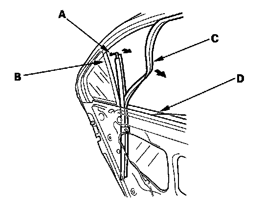 4. Pull the upper portion of the center channel (A) forward to remove it from the door quarter glass seal (B), then pull the glass run channel (C) out from the groove of the center lower channel. Take care not to damage the outer weatherstrip (D).
