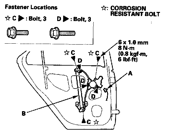 9. Remove the bolts (C), and loosen the bolts (D), then remove the regulator through the hole in the door.