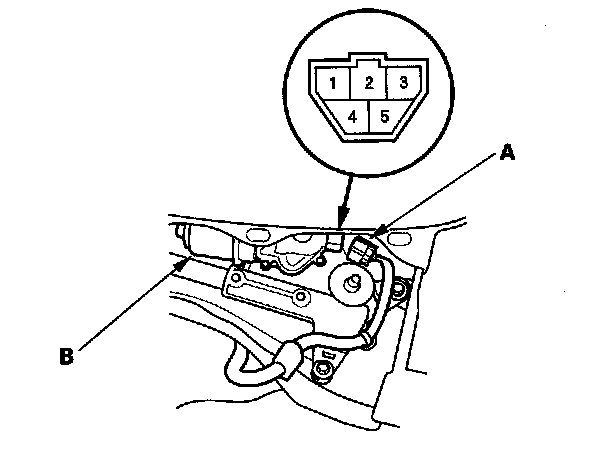3. Disconnect the 5P connector (A) from the wiper motor (B).