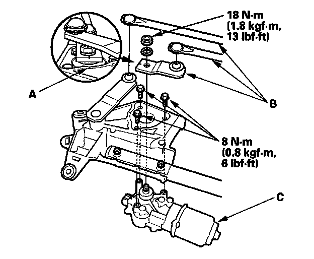 5. Scribe a line (A) across the link and windshield wiper linkage to show the original adjustment. Separate the windshield wiper linkage (B) from the wiper motor (C).