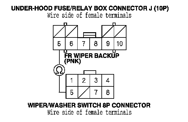 10. Check for continuity between under-hood fuse/relay box connector J (10P) terminal No. 5 and the wiper/washer switch (combination switch control unit) 8P connector terminals No. 5.