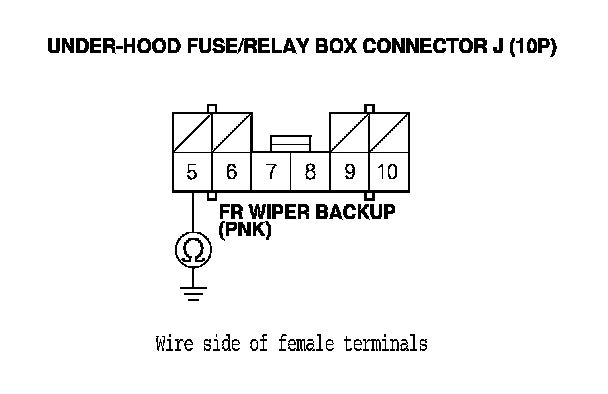 14. Check for continuity between under-hood fuse/relay box connector J (10P) terminal No. 5 and body ground.